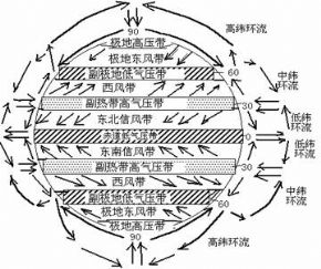 因太阳辐射在地球上各纬度的加热不均引起大气运动,地球不停自转,便产生了三圈环流,同时在地球表面形成七个气压带和六个风带,由于黄赤交角的存在,导致太阳直射点南北回归线之间移动。又由于地球表面的海陆公布,气压带被相应的大陆冷高压或热低压切断,从而产生了季风环流。因而使得大气环流具有复杂性和多样性的特点。