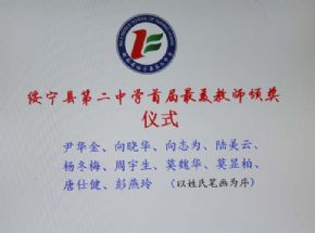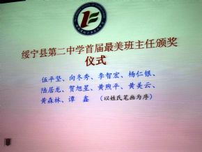 本网讯 3月20日晚,绥宁二中在办公楼五楼会议室为首届最美班主任和最美教师举行颁奖仪式。 2017年下学期末,根据《绥宁二中对高考优胜班级、学考优胜班级、最美班主任、最美教师的奖励方案》,由年级组推荐的候选人,分别在教工代表大会上、全校教工大会上述职,然后与会人员全体不记名投票,分别产生了首届最美班主任十名和最美教师十名。最美班主任是伍平坚、向冬秀、李智宏、杨仁银、陆居龙、贺旭星、黄煦平、黄美云、黄森林、谭 鑫 (以姓氏笔画为序)等十人,最美教师是尹华金、向晓华、向志为、陆美云、杨冬梅、周宇生、莫魏华、莫显柏、唐仕健、彭燕玲(以姓氏笔画为序)。 办公室为每名教师写了颁奖词。刘永跃校长为获此荣誉者颁奖,肖飞跃书记主持颁奖仪式。