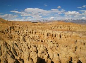 找完金矿后,向老师带领我们前往阿里地区的扎达县测剖面。共产党的好干部孔繁森就是在阿里出车祸献身的。我们在去阿里的路上,就明显感觉到路况很差,而且沿途很难找到吃饭的地方。在札达县,我们目睹了异常雄伟的土林地貌景观(图7)。我觉得从事地质工作,最美妙的就是能够看到很多神奇的地貌,并由此激起我们去探求地球奥秘的热情。